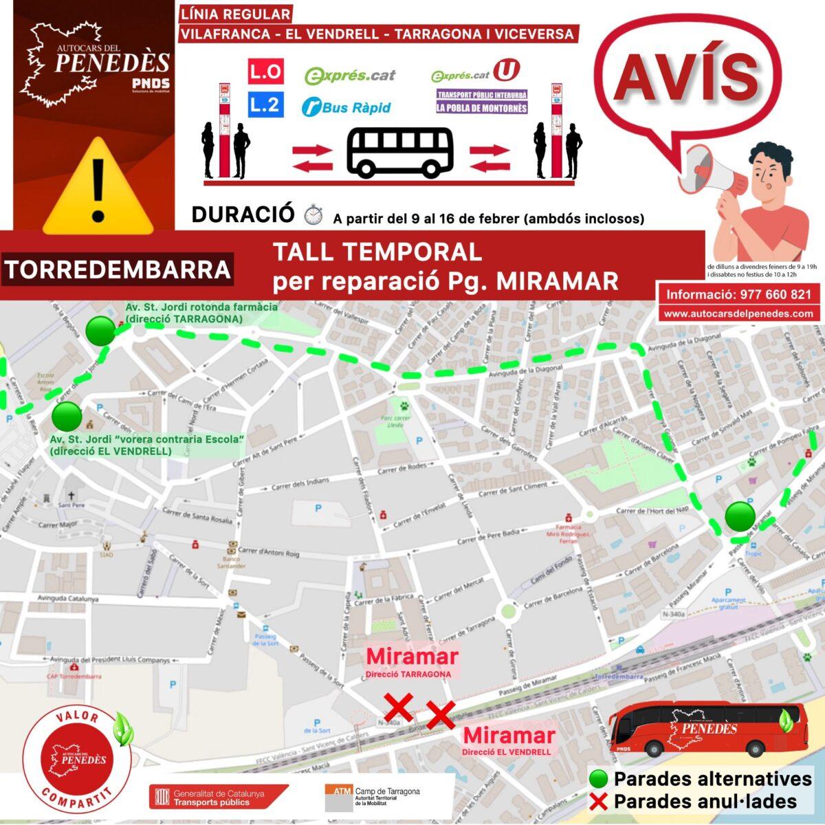 La xarxa de transport interurbà a Torredembarra patirà modificacions significatives durant la segona setmana de febrer. Segons ha informat l’empresa Autocars del Penedès, la realització d’unes obres de reparació urgents al passeig de Miramar obligarà a tallar el trànsit en aquesta artèria principal, afectant directament el recorregut habitual de les línies regulars que connecten el municipi amb Tarragona, el Vendrell i Vilafranca.