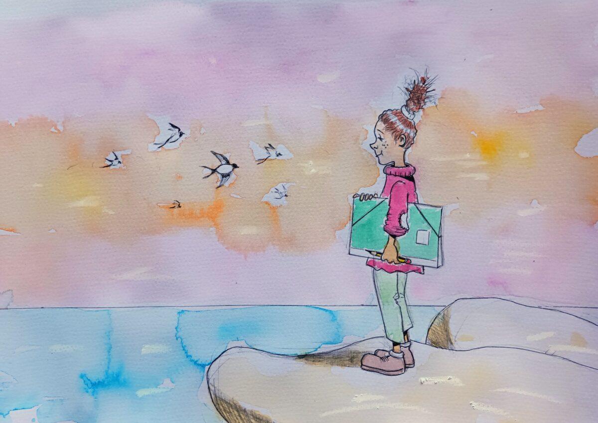 Vaig obrir el calaix de la motxilla i hi vaig treure el vell quadern. Els fulls groguencs encara tenien restes de pols de sal i taques d’humitat. Em tremolaven les mans. Vaig passar les pàgines i vaig veure els meus dibuixos antics: orenetes torçades, de becs massa grossos, d’ales desiguals.